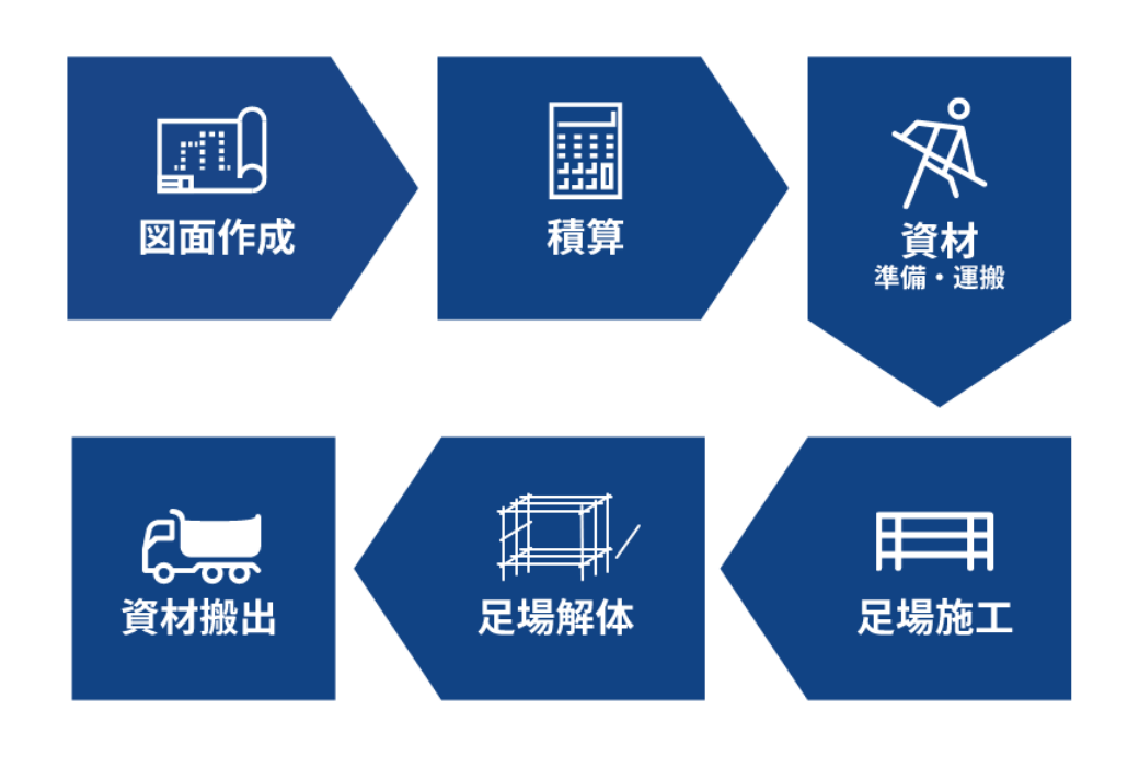 弊社では足場工事を図面作成から足場解体、資材搬出まで、すべて一括請負しております。図面作成の段階から、安心・安全を考慮して足場工事全体を進行していくことは、事故防止につながり、その現場全体の安心・安全につながります。